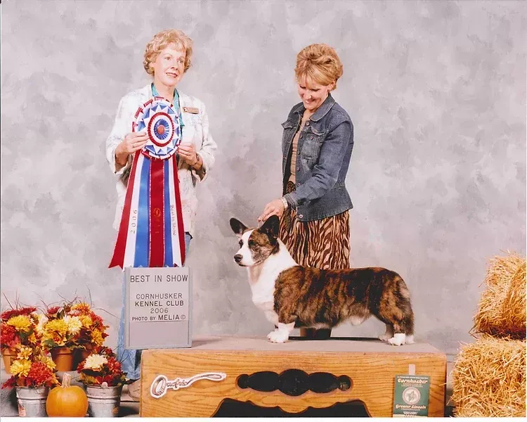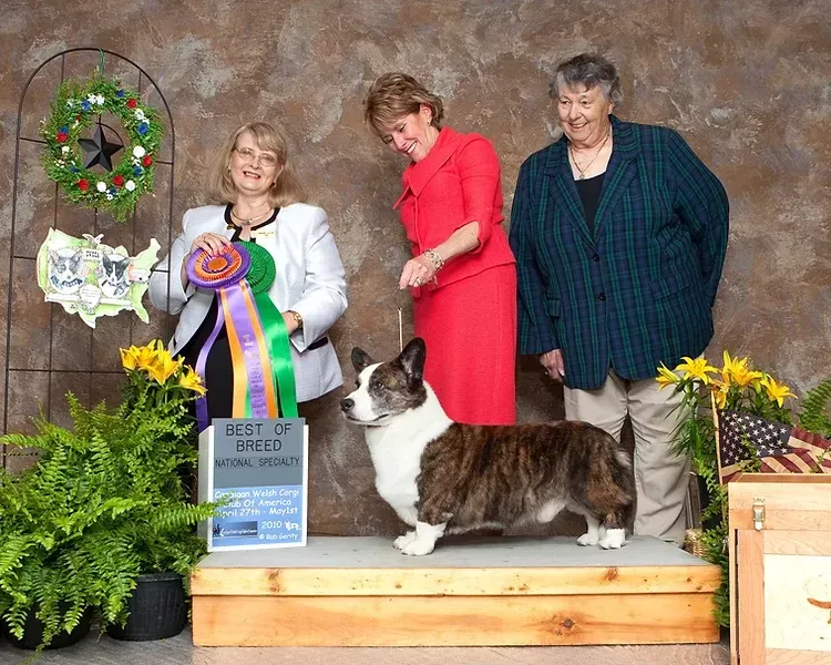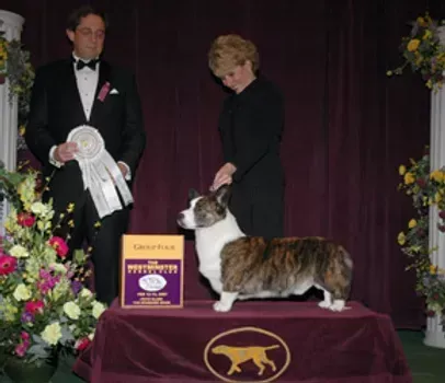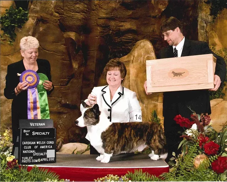 Harry is the top winning male Cardigan in the history of the breed. He was best of breed at the Cardigan national from the veteran’s class in 2010 under the late Marieann Gladstone (Aaragorn) and again in 2012 under Margaret Heaney (Ma Pat Ma). He was the first Cardigan to place in the group at the Westminster Kennel Club dog show, and also the first Cardigan to place in the pastoral group at Crufts dog show in Birmingham, England. His illustrious career wins included more than 100 herding group firsts and 19 all-breed best in shows.
